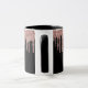 Elegant, Modern Blush Pink Rose Gold Glitter Drips two 2 Monogram Script on black custom personalized name monogrammed mug. Featuring a faux glitter dripping frame, large double hand lettered monogram script cursive font with swashes (large size initials) in blush pink or rose gold colour on black background. Easy to personalize it. Great feminine girly gift for girlfriend, mother, birthday, wedding, bridal shower, sweet 16 birthday party and baby shower, business, home office, professional work and for anyone who like pretty glam things.