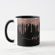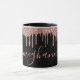 Elegant, Modern Blush Pink Rose Gold Glitter Drips Monogram Script on black custom personalized name or monogrammed mug. Featuring a faux glitter dripping frame, large hand lettered monogram script cursive font with swashes (large size first name) in blush pink or rose gold colour on black background. Easy to personalize it. Great feminine girly gift for girlfriend, mother, birthday, wedding, bridal shower, sweet 16 birthday party and baby shower, business, home office, professional work and for anyone who like pretty glam things.