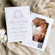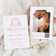 Announce your wedding in style with this romantic rose quartz photo save the date card. The front features your monogram initials inside a graceful rose quartz floral crest, with "Save the Date" elegantly displayed in matching calligraphy on a white background. Personalize with your names, wedding date, and location. The back highlights your vertical engagement photo and includes a QR code guests can scan for quick access to your wedding website. With space for custom instructions, this design adds a charming and modern touch to elegant and romantic wedding themes.