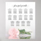 Ce beau tableau de sièges mariage présente une fleur rose rose rose pâle se reflétant dans l'eau avec des vagues et des ondulations. Le titre dit "s'il vous plaît trouvez votre table" dans élégante calligraphie de script en dentelle. Il y a de la place pour les noms du couple et la date du mariage. Ce tableau a des affectations de table pour 140 invités à 14 tables - 10 personnes par table.