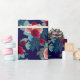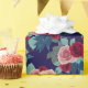 Elegant wrapping paper in navy blue with a floral pattern strewn over it. Roses of peach and pink along with deep red peonies dance in beds of sage, mint and deep blue leaves.