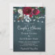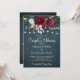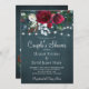 Winter rustic couple's shower party stylish invitation template on a dark midnight blue chalkboard featuring a beautiful burgundy and white peony roses bouquet with dark green seasonal foliage, strings of white twinkle lights, and a chic typography script. ++++++++++++++ Easy to personalize with your details! +++++++++++++++ The invitation is suitable for an elegant winter modern rustic country farmhouse cottage Christmas couples shower, engagement, or other couple parties.