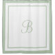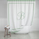 A fresh, sophisticated shower curtain featuring a single script monogram initial framed by a soft sage green border on a clean white background. The nature-inspired color adds a modern, spa-like touch to the classic hotel-inspired design. A lovely gift for new homeowners or anyone who loves on-trend, earthy bathroom decor. The initial is fully customizable.