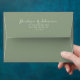 A minimalist boho  chic sage wedding envelope. Which features simple light green colour . With with white handwritten calligraphy of the bride's and groom first names along with the personalized return address label . And customizable return address info..
