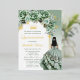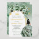 Elegant and classy sage green with gold-tone accents floral bough combined with an arched panel on a faded sage green background "Quinceañera" party design. Features a dark brown to black-haired brunette beauty in a flowing sage-coloured ball gown and a faux alcohol and ink marbled back. Composite design by Holiday Hearts Designs.