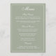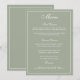 An elegant way to show your guests their menu options. In sage green with white writing. An elegant script wedding font has been combined with a modern style all caps font creating a stylish, yet user friendly wedding menu.