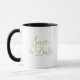 Celebrate your upcoming wedding in style with this elegant “Save the Date” mug. Featuring gold script text and space to personalize names, date, and location, it's the perfect keepsake for the bride, groom, or wedding party. A classy gift idea or announcement your loved ones will actually use!