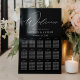 Modern wedding seating chart featuring "Welcome" displayed at the top in an elegant white calligraphy script with a black acrylic background. Personalize the minimalist black and white seating chart with your names, wedding date, and guest names for your 15 tables. The design coordinates with our Modern Elegant wedding collection.