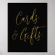 Simple and elegant wedding sign featuring the phrase "Cards and Gifts" displayed in a gold foil script with a black background. Personalize the black and gold foil cards and gifts sign with custom text such as your names, wedding date, thank you message, etc. The sign can also be used for other events such as bridal showers, baby showers, birthday parties, & more!