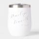 This contemporary wedding Stemless Thermal Wine Tumbler features a minimalist horizontal composition and the bride and groom names in a stylish script calligraphy in black.