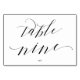 Simple Elegant Calligraphy Script Wedding or Dinner Party Table Number Nine written out in beautiful flowing fancy letters. A stylish yet simple formal design in black and white or any background colour you choose. Just click the customize further link, shown under the text personalization area on the right, and choose your custom colour background. This sign poster template makes it fast and easy to create stunning additions to your wedding decor. Signs can be enlarged, there are many sizes to choose from, as well as options for custom framing and matting. Welcome to our wedding custom signage.