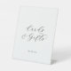 This elegant script cards and gifts pedestal sign is perfect for a simple wedding or bridal shower. The minimalist black and white design features fancy romantic typography with modern glam style. Customizable in any colour. Keep the design minimal and classy, as is, or personalize it by adding your own graphics and artwork. The line of text at the bottom of the sign can be personalized with the date, the names of the bride and groom, or a short message like "Thank you". This sign can be used for a wedding or any event or party.