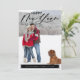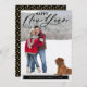 Élégante typographie noire, superposition photo "Bonne année", Carte du Nouvel An. Modèle fournit une seule photo sur le devant avec une ligne de modèle unique pour votre nom //année en étiquette simple encadré en bas. Le dos de la carte comporte un faux motif pointillé en feuille d'or sur arrière - plan noir.