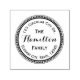 Your family name in pretty handwritten style script writing. Pretty and elegant dots in a round shape border this trendy circular rounded lettering return address stamp. Impress friends and family with an awesome flair for elegance and modern style. Stylish swirly last family name going across. Your address wraps around the perimeter of the stamp for a beautiful display. Great for cards, personal or business use.