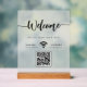 Faites une impression mémorable avec notre élégant script de bienvenue WIFI QR Code Metallic Gold Pedestal Sign. Ce design simple mais élégant présente un script d'accueil élégant avec un logo wifi simple ci-dessous dans un style moderne contre un arrière - plan en or métallisé faux brossé. Les informations réseau, y compris le mot de passe, sont bien mises en page de manière spacieuse.