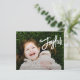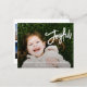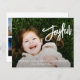 Carte de Noël religieuse de style moderne avec un design simple et minimal avec "Joyful" dans un élégant script de brosse blanche avec votre message et nom de famille sur votre photo préférée. Le dos a un collage photo composé de six photos carrés.