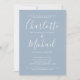 Featuring signature style names, this elegant, modern simple engagement party invitation can be personalized with your information in chic white lettering on a dusty blue background and your special photo on the reverse. Designed by Thisisnotme©