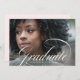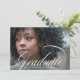 This elegant graduation party invitation features the graduate's personal photo on the front, with a swirly white script calligraphy overlay. Your party information goes onto the back on a blush pink background.