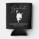 Custom black can cooler for her graduation party party featuring an illustration of a graduate celebrating in her cap and gown, "Graduate" in an elegant white script and her name and class year in simple white typography.
