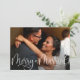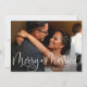 This elegant yet modern holiday photo card features white calligraphy script over a full-bleed single, horizontal photo. The greeting on the front says "Merry and Married". This design accommodates a single, horizontal photo on the front of the card. On the reverse side you will find a simple grey and white diagonal stripe pattern which can be removed or customized. You can also add another photo or text to the back by selecting "customize design further".