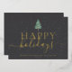 Modern elegant happy holidays Business Logo charcoal gray and gold foil holiday Greeting Card with a stylish Minimalist Watercolor snowy Woodland christmas pine tree with festive lights and whimsical Gold Foil Script