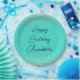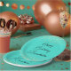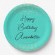 These event or party plates feature an elegant, classic theme on a turquoise or teal coloured background. The greeting, "Happy Birthday" is printed in a black script font across the centre, followed by a sample name in a matching script font. You can personalize the plate to include your own custom name or other text. Gold glitter confetti accents the top and bottom portions of the plate.