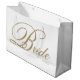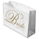 Grand sac cadeau Mariée. Élégant script or Bride sur un arrière - plan blanc avec date mariage dans le texte de bloc classique en bas à droite. La date du mariage peut être supprimée en désactivant le champ de texte ou modifiée pour ajouter des initiales de mariée et de mariée.
