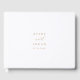 Cet élégant livre d'or monogramme mariage est parfait pour un mariage simple. Le design minimaliste or et blanc présente une typographie romantique avec style glamour moderne. Personnalisable dans n'importe quelle couleur. Gardez le design minimal et élégant, tel quel, ou personnalisez-le en ajoutant vos propres graphiques et artwork. Personnalisez la couverture avec les noms de la mariée et du marié et la date du mariage.