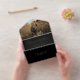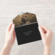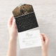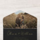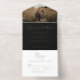 Elegant black all-in-one wedding invitation featuring your photo on the top flap, your first names, "Reception to follow" and "Rsvp" showcased in a chic script, your invitation details in classic serif typography, and a white tear-away RSVP postcard, with all inside text rendered in your choice of genuine gold, silver or rose gold foil. If desired, you can adjust the size of the script for longer or shorter names by editing in the design tool.