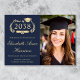 Announce a proud academic achievement with this elegant dark blue college graduation announcement, featuring a portrait of your graduate, a timeless laurel crest with a grad cap mortarboard and diploma encasing their class year, and classic gold script and serif typography -- creating a traditional look that feels polished and enduring. The clean design showcases the graduate’s name, university, degree, and class year in a clear, sophisticated format -- perfect for sharing milestone news with family and friends. Fully customizable, this graduation announcement allows you to adjust it for a high school graduate as well.