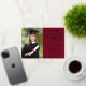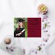 Modern burgundy red college graduation party invitation featuring real gold foil, "Class of" in an illustration of laurel wreath incorporating a grad cap topper and diploma, the graduate's photo and their name in an elegant script. Add their school, major, honours or future plans. On the back, add the grad party details in simple light gold typography.