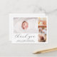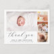 This chic timeless birth announcement and photo thank you postcard is ideal for anyone who wants to thank guests at their baby shower for the gifts, love, and support they have received and to introduce their new member of the family. The modern, elegant design has a minimalist style and features four customizable photos placed in the collage, simple elegant typography for your information, and a chic script for a ´´thank you´´ header. On the reverse, there is a customizable thank-you message with your names. Use the "customize" button to replace photos and edit text.