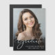 This elegant graduation magnetic keepsake announcement features the graduate's photo with "Graduate" overlayed in a stylish white script and their name, school and class year in simple white typography.