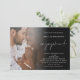 Elegant Script Photo QR Code Engagement Black. A modern minimalist design. Simply replace the sample photo with your own favourite. A black gradient overlay layer is on top of your photo so it fades out as it reaches the centre with the text partially overlaid on top. Engagement is in a modern set script and easily personalise the rest of the text. With parties in mind taking place in a hotel or restaurant (or any venue with a website), replace the QR code on the back with a QR code to their website. Simply change the sample url with the url of your venue to automatically generate the QR code. You can also delete the QR code and text on the back if not required via customize further.