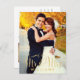 Personalized wedding thank you post card template features a photo on the front and back, "Mr. & Mrs." in an elegant champagne gold coloured script font with the married last name, and custom black text thank you message that can be personalized.