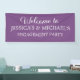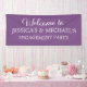Cute, elegant script purple engagement party welcome banner, personalized with the name of the bride and groom to be.  The background colour of this banner is customizable with Zazzle's design tool, so whatever your engagement party colour theme, you can create your banner to match.  Contact me for help with customization or to request additional products for your suite.