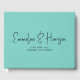 Create a simple unique modern typographic light teal wedding guest book that includes your first names in a pretty black handwritten script font, contrasted with your wedding date, wedding location city and state. Simple elegance in a modern minimalist style.