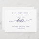 Announce your wedding date with this beautiful wedding save the date card. Modern hand written Script details in navy blue faux foil in both front and back over white background. Back with unique Save the Date stamp/monogram with couples names in white. Clean and simple style. White and navy design. Same design with back in navy blue and text in white also available. Area for wedding website, more information or/and message for your guests (i.e. "Can't wait to see you there!").