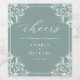 These elegant sea green wedding or rehearsal dinner wine bottle labels feature the look of white printing on a sea green background. This sea green is a deeper blue green colour. The word "Cheers" is in an elegant script and is surrounded by a classic vintage ornate frame corners design. It's perfect for a classy, sophisticated blue green wedding or rehearsal dinner. See all of the matching products in my collection below.