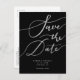 Elegant and modern save the date template postcard featuring a hand lettered calligraphy text that says "Save the Date" in faux silver on a black background. On the back of the card you can add a brief message of your relationship and how you're excited for your wedding celebration. This typography design is simple yet stylish!