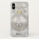 A phone case with a magical holiday design. Featuring a silver Christmas ball with snowflake decorations and finished off with a pretty silver bow. The background is a silver bokeh lights illustration with elegant stars scattered throughout.