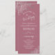 This beautiful wedding program features an elegant design with white text on a dusty rose or mauve pink background and lacy silver grey faux foil curls and swirls in the corners. The titles are written in fancy script calligraphy, and there is space for your ceremony and wedding party details, as well as a short thank you for your guest. Wonderful way to welcome your friends and family to your wedding celebration.