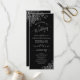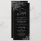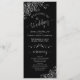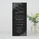 This beautiful wedding program features an elegant design with pale grey text on a classic black background and lacy silver grey faux foil curls and swirls in the corners. The titles are written in fancy script calligraphy, and there is space for your ceremony and wedding party details, as well as a short thank you for your guest. Wonderful way to welcome your friends and family to your wedding celebration.
