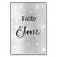 The table number is written with an elegant hand lettered style script. Black letters, a faux silver background with faux glitter dust, sparkles.