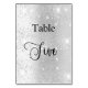 The table number is written with an elegant hand lettered style script. Black letters, a faux silver background with faux glitter dust, sparkles.