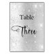 The table number is written with an elegant hand lettered style script. Black letters, a faux silver background with faux glitter dust, sparkles.
