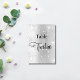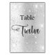 The table number is written with an elegant hand lettered style script. Black letters, a faux silver background with faux glitter dust, sparkles.