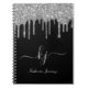 Elegant, Modern Silver Grey Glitter Drips 2 Monogram Script on black custom personalized name monogrammed notebook. Featuring a faux glitter dripping frame, large double hand lettered monogram script font with swashes (large size initials), and a full name in grey colour on black background. Easy to personalize it. Great feminine girly gift for girlfriend, mother, birthday, wedding, bridal shower, sweet 16 birthday party and baby shower, business, home office, professional work and for anyone who like pretty glam things.