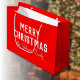 A classic Christmas gift bag with a vibrant red colour. Featuring bold, modern white text that reads "Merry Christmas," alongside a personalized handwritten name or surname of the recipient, making it a thoughtful and unique touch for holiday gifting.