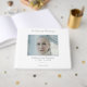 Honor a beautiful life with this modern minimalist funeral photo guest book featuring a cherished photo and the timeless phrase “In Loving Memory” in a soft grey color. Simple and elegant funeral guest book featuring clean script typography, a photo template, a subtle scroll line accent and comforting saying on the back. Designed for memorial services, sympathy keepsakes, remembrance cards, and celebration of life events. Easily customizable for your memorial event. Timeless minimalist memorial stationery. You can find other tastefully designed funeral stationary and signs in the Modern Minimalist In Loving Memory Collection in The Gathering Designs store.
